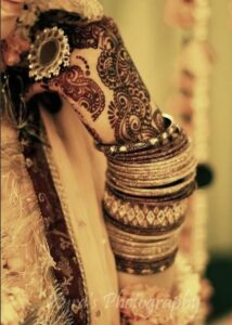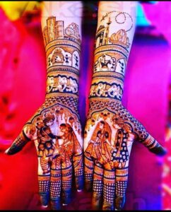 Features elaborate designs with heavy detailing, often with intricate patterns on both hands, wrists, and sometimes feet, signifying the union of the bride and groom.